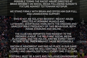 俱乐部已将此事报告给英超联赛、相关社交媒体平台以及警方,我们期望能迅速对责任人采取行动。种族主义是可憎的,在我们的足球运动和整个社会中没有立足之地,只要此类事件发生,我们就会继续清晰且毫不妥协地予以谴责。足球必须为所有人提供一个安全且包容的环境——毫无例外。”