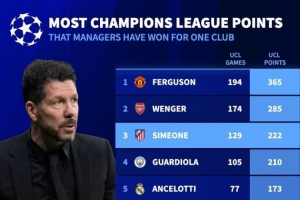 执教单一俱乐部欧冠拿分榜:弗格森365分、温格285分、西蒙尼222分