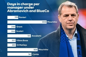 切尔西在阿布时代主帅平均执教529天,BlueCo时期平均执教258天