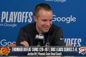 体育资讯4月23日讯 NBA季后赛,太阳107-120不敌雷霆,大比分0-2落后,赛后太阳主帅乔丹·奥特接受了媒体采访,以下为采访全文。