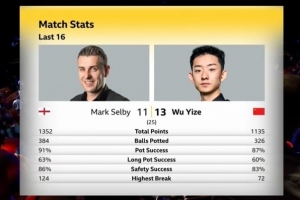 体育资讯4月28日讯 斯诺克世锦赛1/8决赛,吴宜泽13-11击败塞尔比晋级,而在全场数据统计中,吴宜泽全面落后。